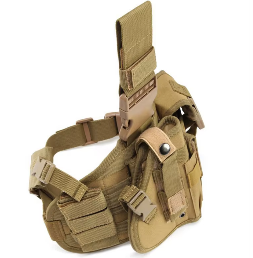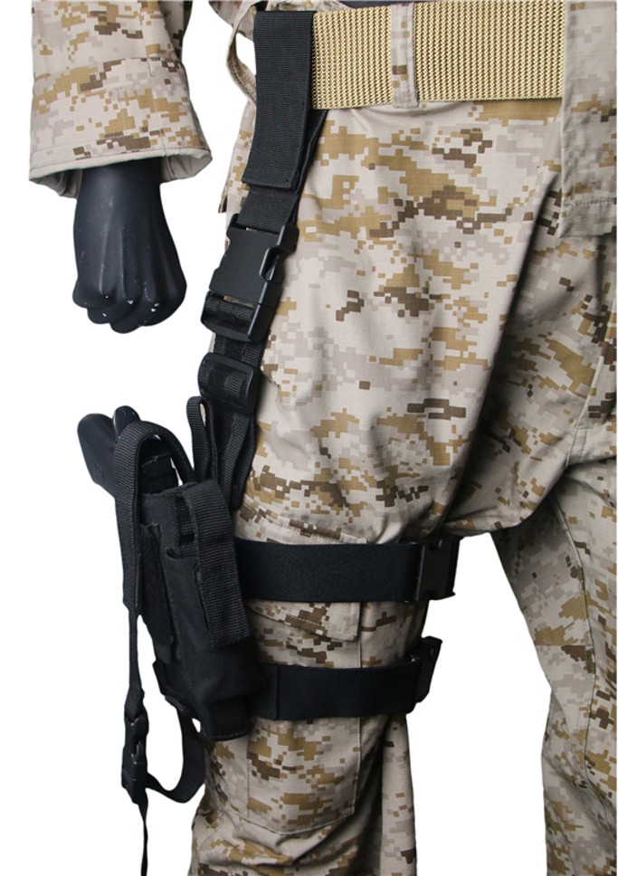 ④拳銃格納時は,サイドリリースバックル付きストラップによって,拳銃が固定可能。